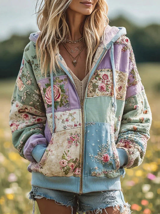 Damska koszulka z kapturem w stylu vintage z motywem patchworku, przytulna, ciepła bluza z kapturem