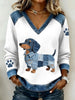 Damski piękny jamnik z denimowym patchworkiem z dekoltem w szpic