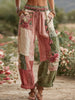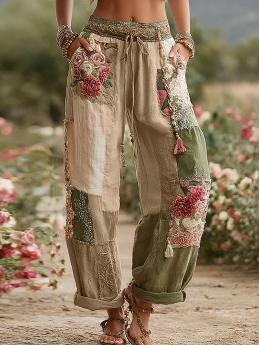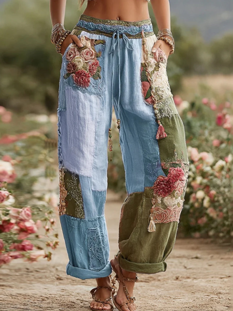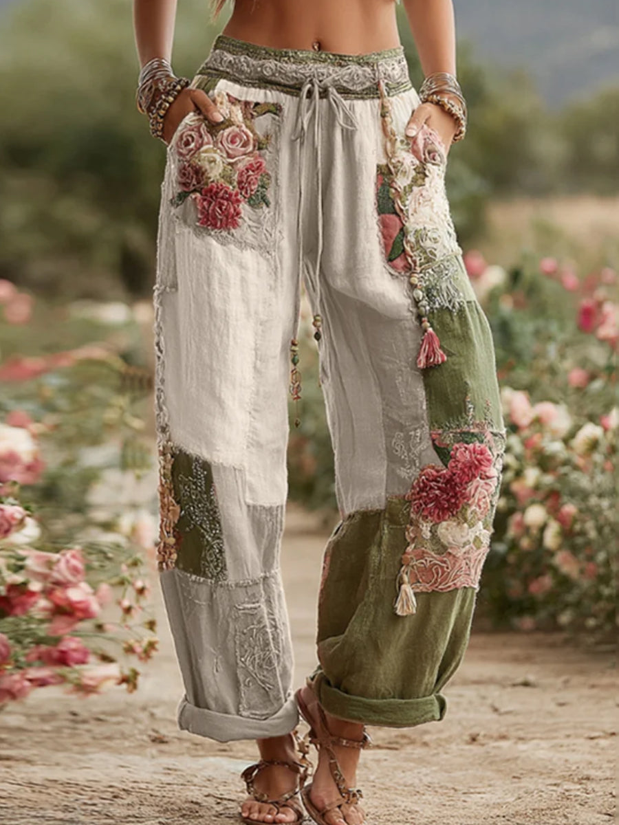Damskie spodnie w stylu vintage z różą i kwiatem Patchwork Art Len